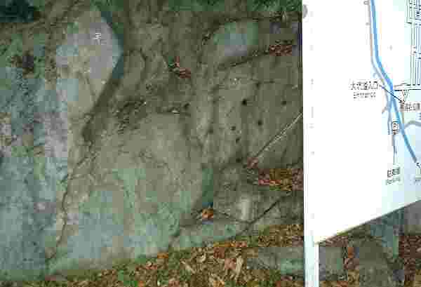 松代大本営-舞鶴山(ロ地区) 地下壕入り口、案内板の後ろの岩盤。発破でダイナマイトを詰める穴が多数残っている。 -jpeg 14KB |